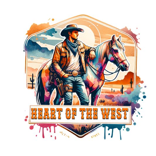 Ilustración colorida con temática del oeste que presenta a un vaquero con un caballo, titulada "Corazón del Oeste". ¡Perfecta para cualquier estilo rústico!