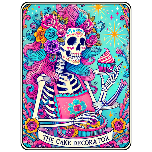 Precio habitual A partir de £0.75 GBPPrecio habitualPrecio unitario / por£2.40 GBPPrecio de oferta A partir de £0.75 GBPUna ilustración colorida y caprichosa de una decoradora de pasteles con forma de esqueleto, adornada con flores y cabello vibrante, que muestra su espíritu creativo.