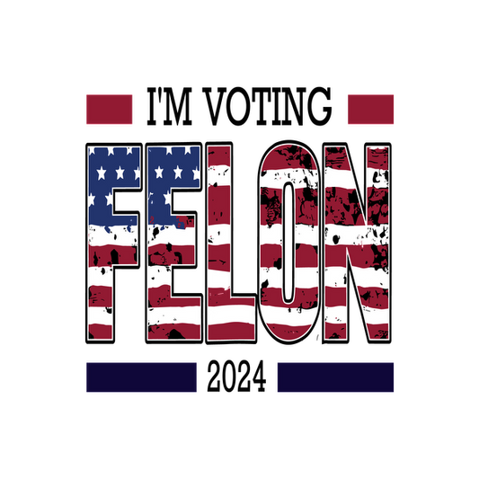 Un diseño gráfico audaz que presenta la palabra "FELON" adornada con un patrón de bandera estadounidense desgastada, enfatizando una declaración visual impactante.