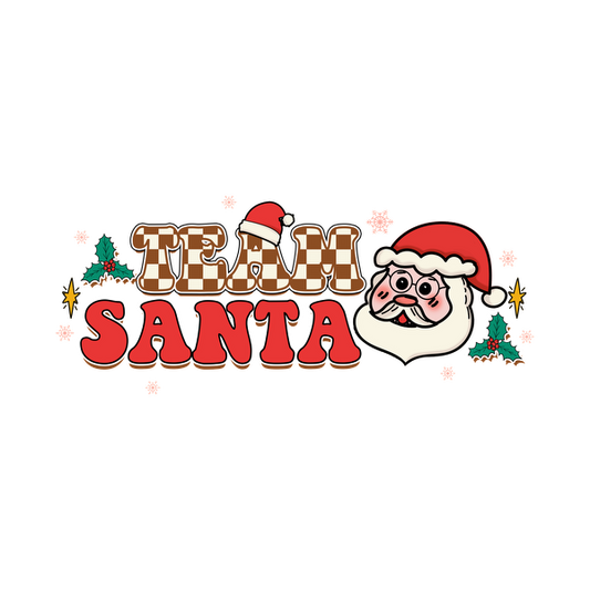 Gráfico festivo "Equipo Santa" que presenta un alegre Papá Noel y alegres elementos navideños, ¡perfecto para el espíritu navideño!