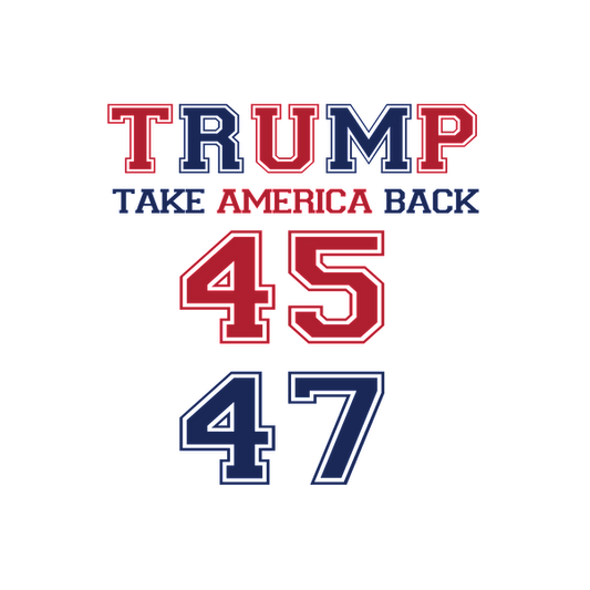 Gráfico llamativo que presenta "TRUMP" y "TAKE AMERICA BACK", con los números 45 y 47 en rojo y azul.