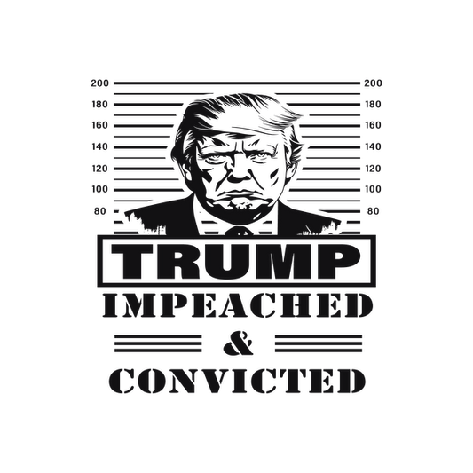 Un gráfico que ilustra una imagen estilo foto policial con el texto "TRUMP IMPEACHED & CONVICTED" (TRUMP ACUSADO Y CONDENADO), resaltando una declaración política controvertida.
