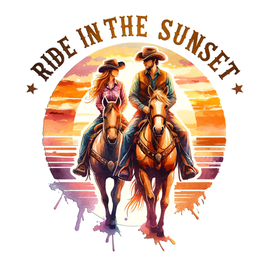 Una romántica ilustración con temática de vaqueros que presenta a una pareja montando a caballo al atardecer, rodeada de colores vibrantes y la frase "Cabalga en el atardecer".