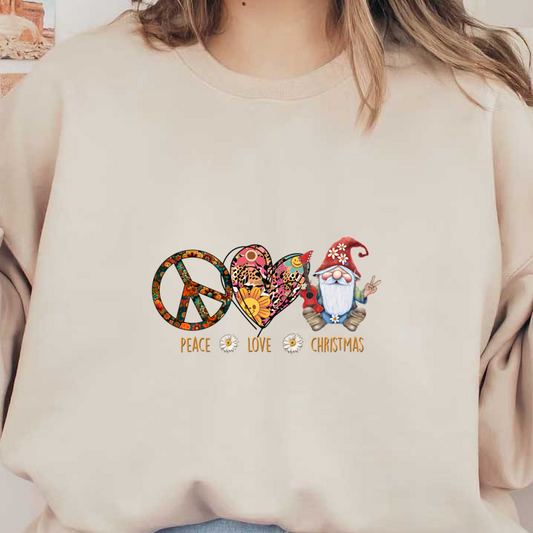 Un gráfico alegre que presenta un símbolo de paz, un corazón y un gnomo caprichoso, que celebra la paz, el amor y la Navidad.