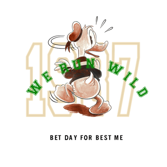 Una divertida ilustración del Pato Donald con el texto "WE RUN WILD" y el año "1937" destacado.