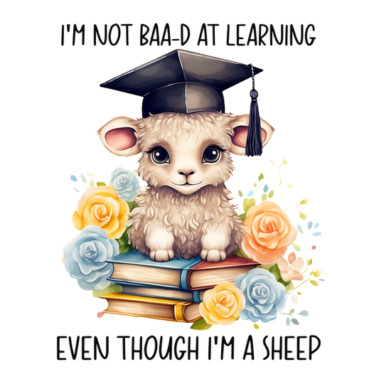 Una simpática oveja de dibujos animados con un birrete de graduación está sentada sobre una pila de libros coloridos, rodeada de hermosas flores y un lema divertido.