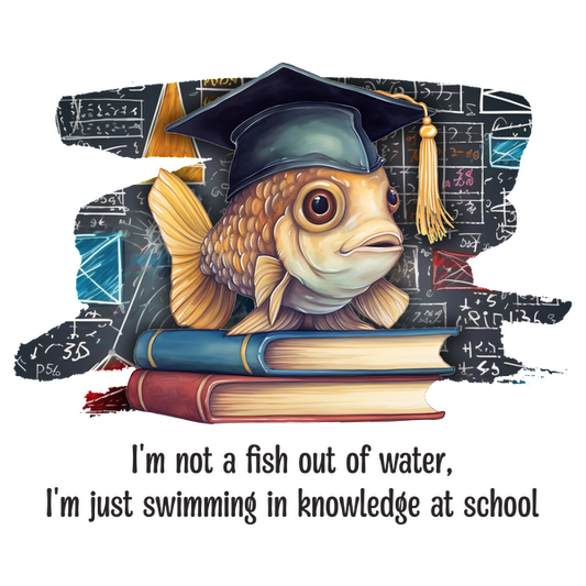 Una inteligente ilustración de un pez con un birrete de graduación, posado juguetonamente sobre libros con un fondo de ecuaciones matemáticas.