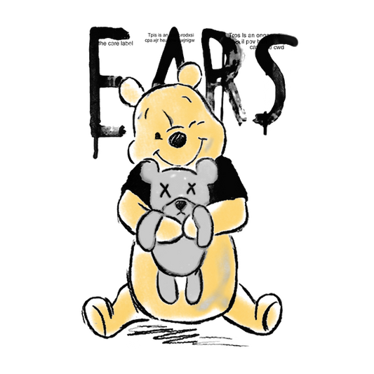 Una divertida ilustración que presenta un alegre oso con un juguete, rodeado de un texto en negrita y estilizado que dice "OREJAS".