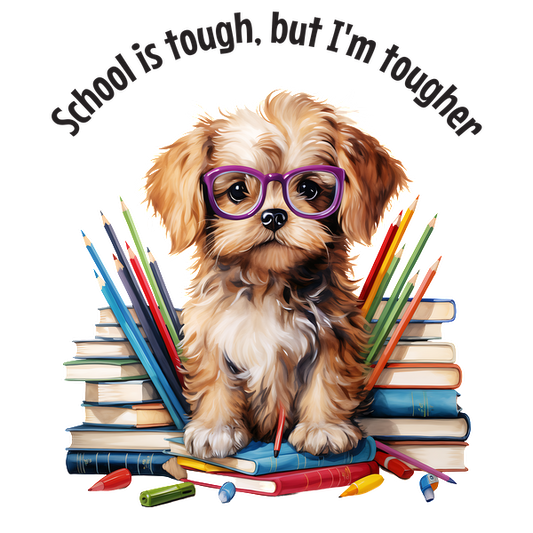 Precio habitual A partir de £0.75 GBPPrecio habitualPrecio unitario / por£2.41 GBPPrecio de oferta A partir de £0.75 GBPUn lindo cachorro con anteojos se sienta encima de una pila de libros, rodeado de lápices de colores, enfatizando la resiliencia con la frase: "La escuela es dura, pero yo soy más fuerte".