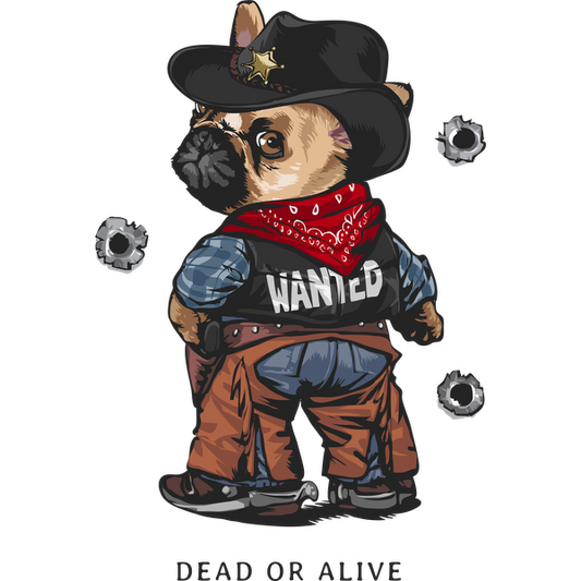 Una divertida ilustración de un pug vestido de vaquero, con un pañuelo y un chaleco con la leyenda "WANTED", captura un divertido tema occidental.