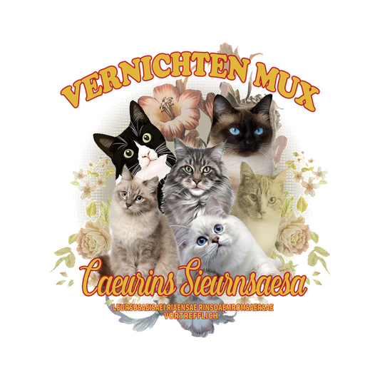 Un diseño caprichoso que presenta un collage de varias caras de gatos rodeadas de elementos florales y texto divertido, perfecto para los amantes de los gatos.