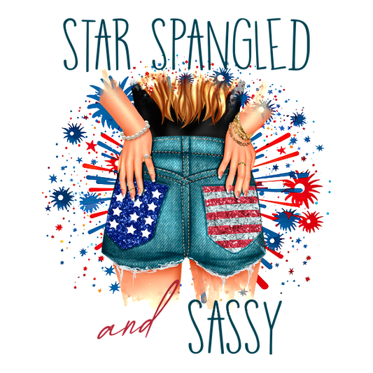 Celebre la libertad con este gráfico moderno que presenta "Star Spangled and Sassy" junto con elegantes pantalones cortos de mezclilla adornados con banderas estadounidenses.