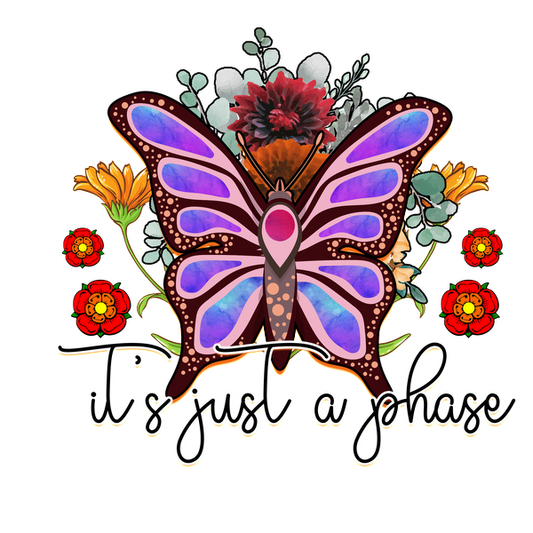 Una mariposa vibrante adornada con flores y la frase "es solo una fase", que combina la naturaleza con un mensaje caprichoso.