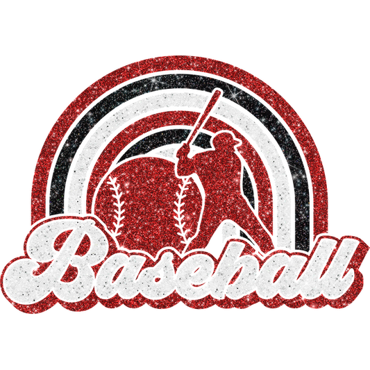 A glittery baseball-themed design featuring a player swinging a bat against a colorful rainbow background, showcasing vibrant red and white colors.DTF Transfers dtf transfers