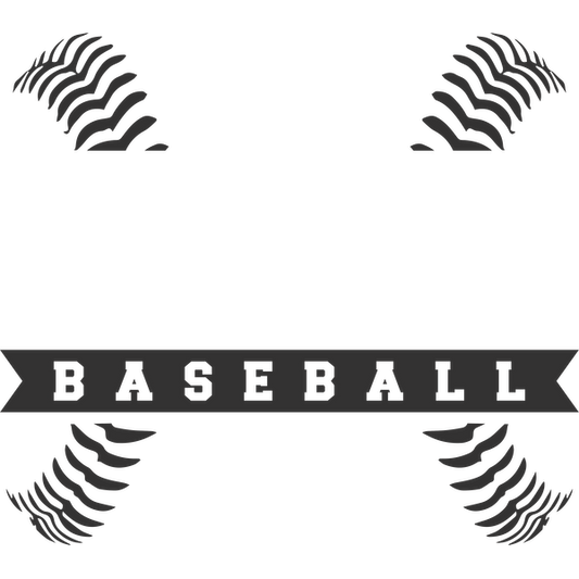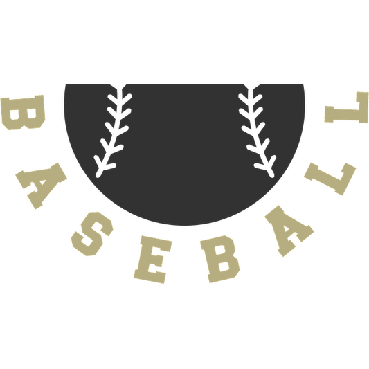 Un gráfico elegante con temática de béisbol que presenta media pelota de béisbol con costuras cosidas y la palabra "BASEBALL" dispuesta de manera creativa a su alrededor. Transferencias DTF
