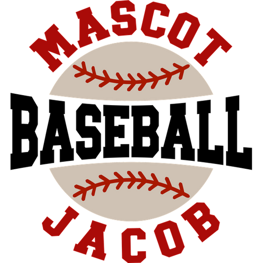 A playful baseball-themed design featuring the words "MASCOT" and "JACOB" in bold red around a baseball stitch graphic.DTF Transfers heat press transfers