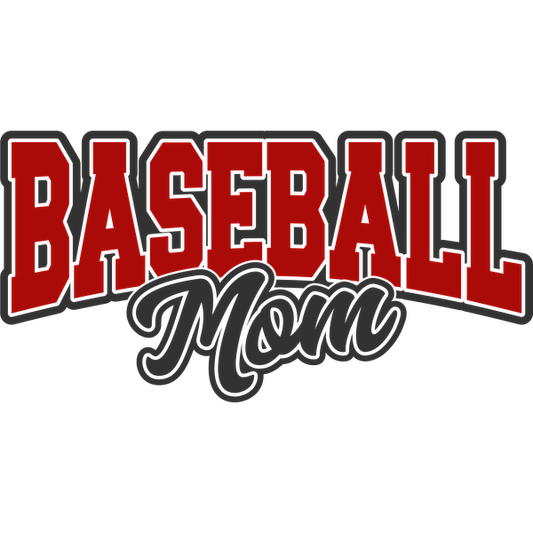 Un diseño gráfico audaz y elegante que proclama "BASEBALL Mom" en rojo y negro, perfecto para apoyar a las madres amantes del béisbol. Transferencias DTF