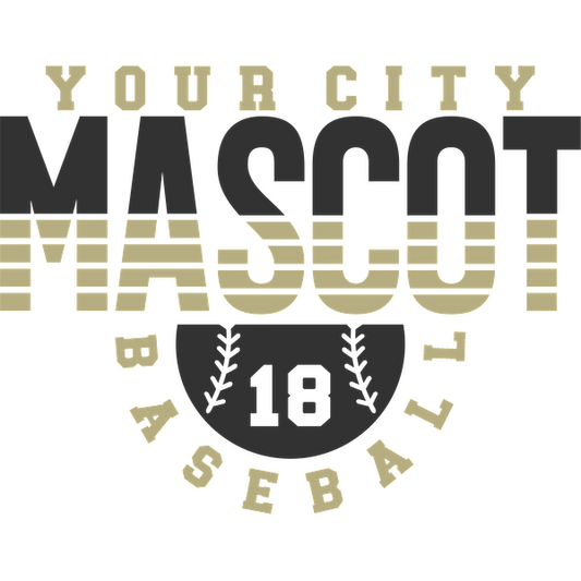 A stylish baseball-themed graphic featuring "YOUR CITY MASCOT" and "BASEBALL 18" with a baseball design.DTF Transfersdtf regular iron