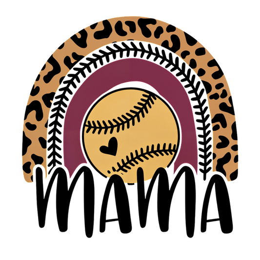 Una ilustración colorida y divertida de un arcoíris con estampado de leopardo y una pelota de béisbol en el centro, rematada con la inscripción "Mamá". Transferencias DTF