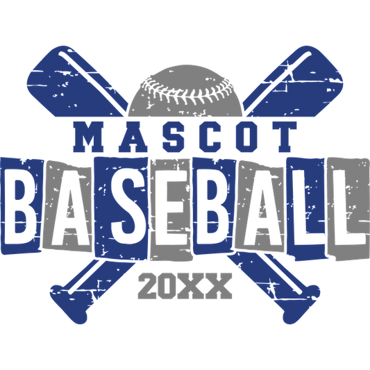 Un logotipo divertido y deportivo que presenta bates de béisbol cruzados, una pelota de béisbol y las palabras "Mascot Baseball" con un marcador de posición para el año. Transferencias DTF