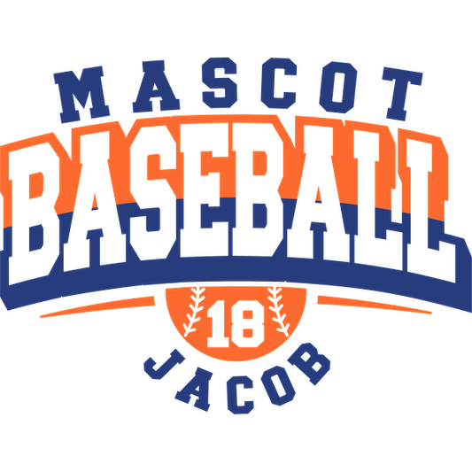 Un gráfico vibrante con temática de béisbol que presenta "Mascota" y "Jacob 18" en letras en negrita, perfecto para una camiseta de equipo o producto promocional. Transferencias DTF