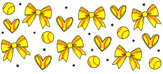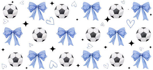 A playful pattern featuring black and white soccer balls adorned with light blue bows and whimsical heart designs on a dark background.UV Transfers heat press transfers