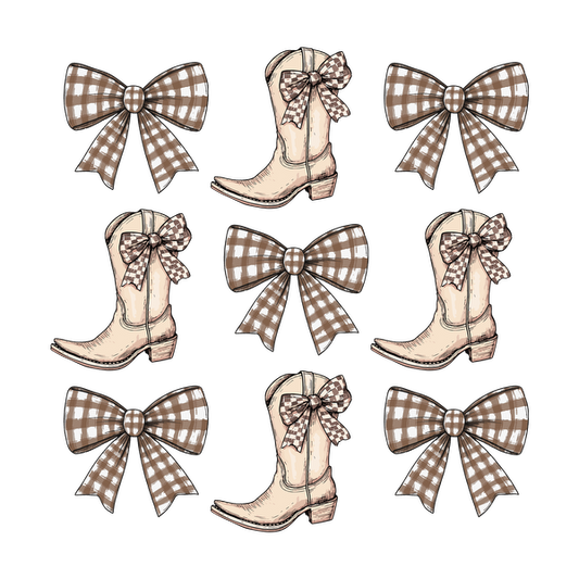 Este encantador patrón presenta botas de vaquero beige adornadas con elegantes lazos a cuadros marrones, perfectos para una estética rústica.