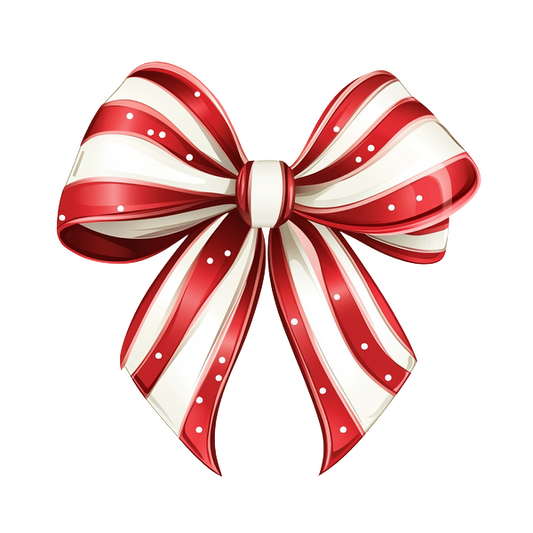 Un lazo festivo de rayas rojas y blancas con lunares, perfecto para decoraciones navideñas o para envolver regalos.