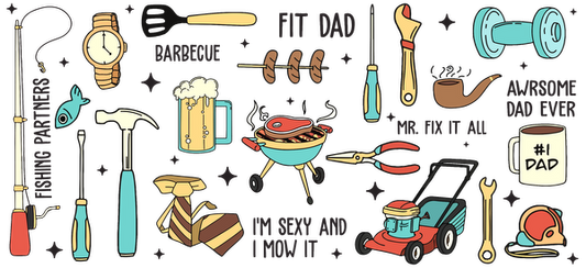 Assorted tools, mug, and watch on a black background.UV Transfers