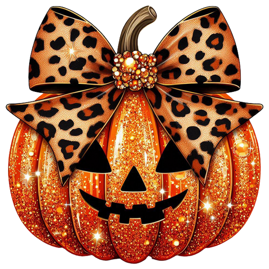 Calabaza de Halloween de color naranja brillante adornada con un lazo con estampado de leopardo brillante y que presenta una divertida cara tallada.
