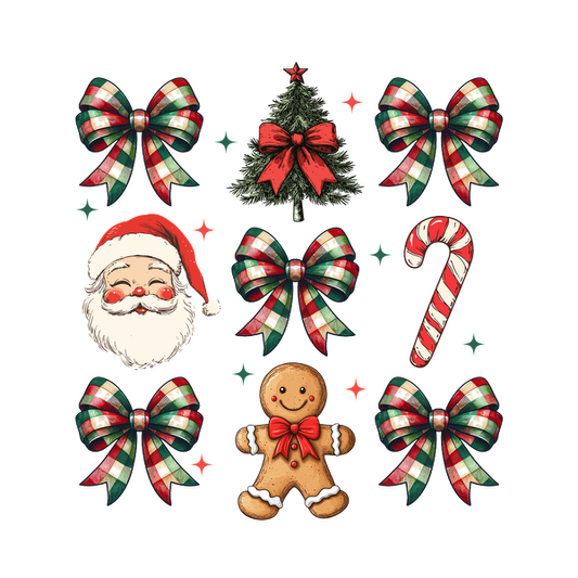 Una colección festiva de ilustraciones con temática navideña que presenta a Papá Noel, un hombre de jengibre, un árbol de Navidad, un bastón de caramelo y lazos decorativos.