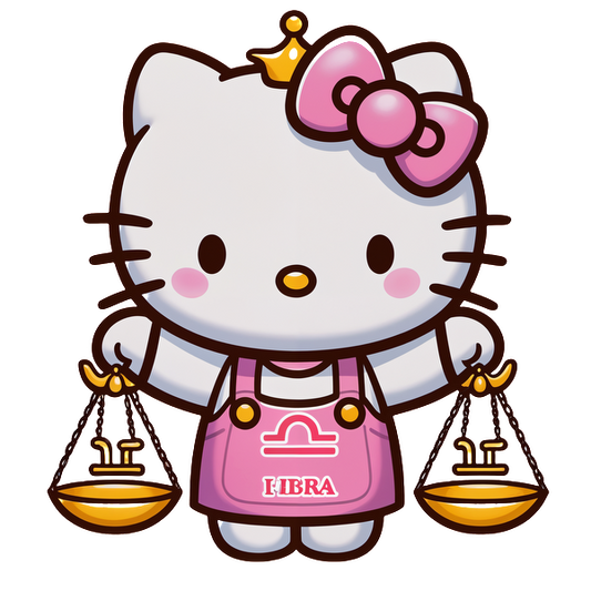 Hello Kitty está vestida con un delantal rosa con el símbolo de Libra, sosteniendo una balanza y luciendo su lazo característico. Transferencias DTF