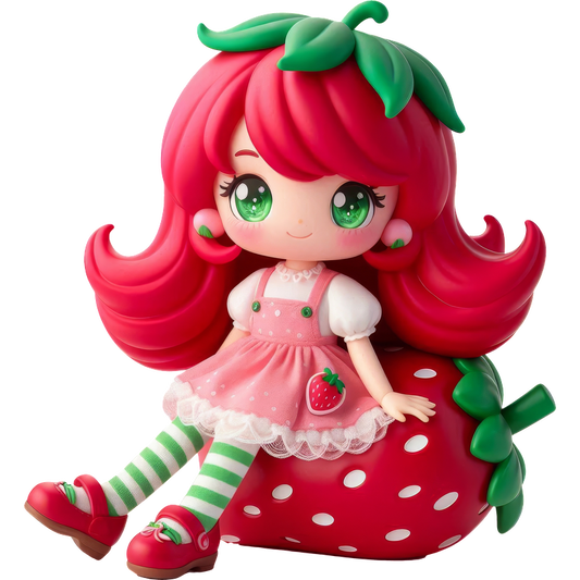 This adorable doll features vibrant pink hair, green eyes, and a strawberry-themed outfit, sitting on a cute strawberry base.DTF Transfers