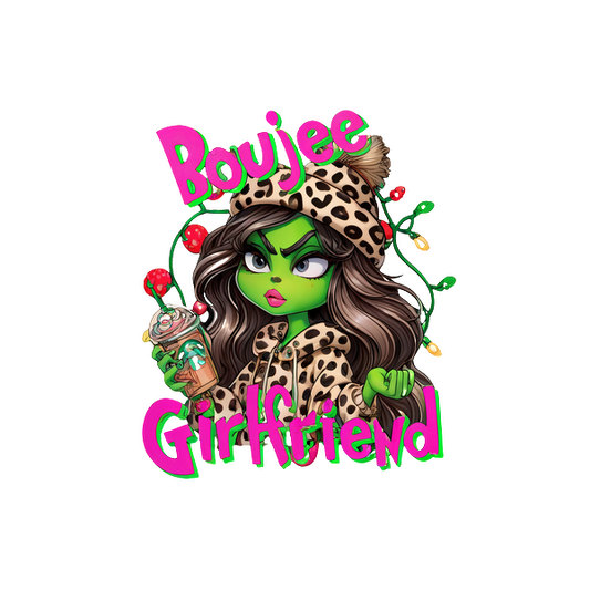 A stylish cartoon character in a leopard-print hoodie, holding a drink, with the text "Boujee Girlfriend" in vibrant colors.DTF Transfers dtf transfers dtf prints