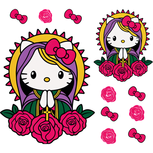 Una colorida ilustración de Hello Kitty con estilo de santa, rodeada de rosas vibrantes y lazos rosas, irradia encanto y fantasía. Transferencias DTF
