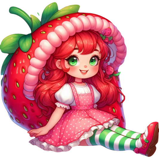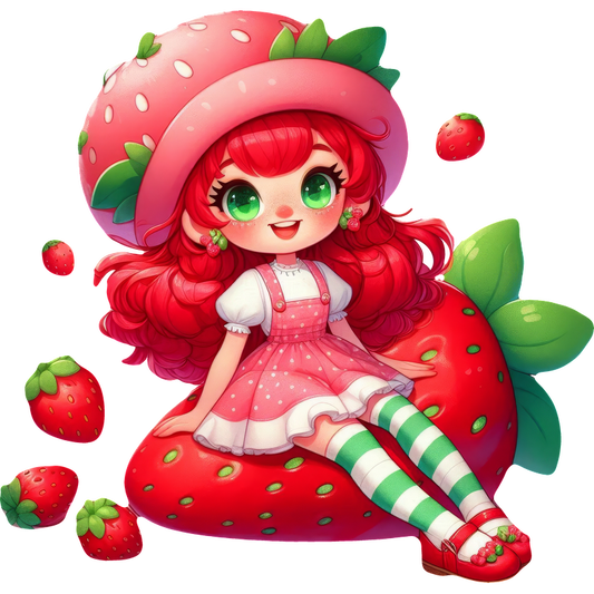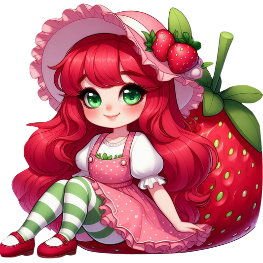 This whimsical illustration features a character with vibrant red hair, wearing a strawberry-themed outfit and sitting on a giant strawberry.DTF Transfers