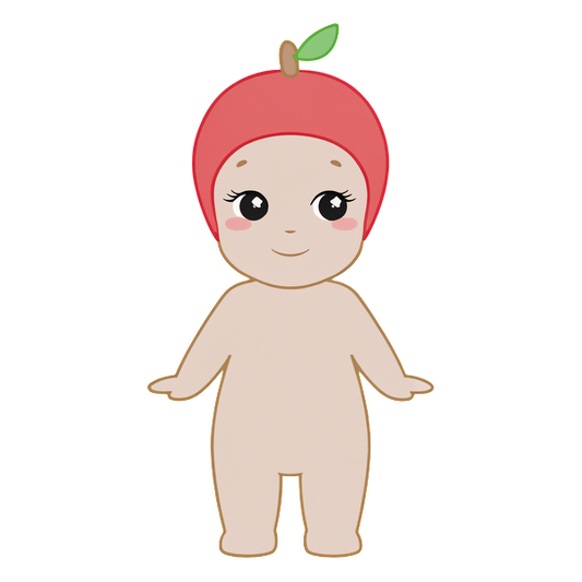 Un simpático personaje de dibujos animados de un bebé que lleva un sombrero rojo brillante en forma de manzana, presenta ojos grandes y expresivos y una sonrisa feliz. Transferencias DTF