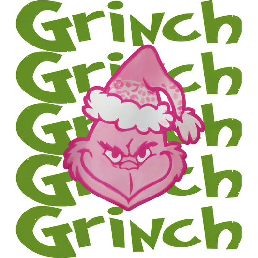 A playful pink Grinch character wearing a festive hat stands against a backdrop of bold green "Grinch" text.DTF Transfersdtf regular iron