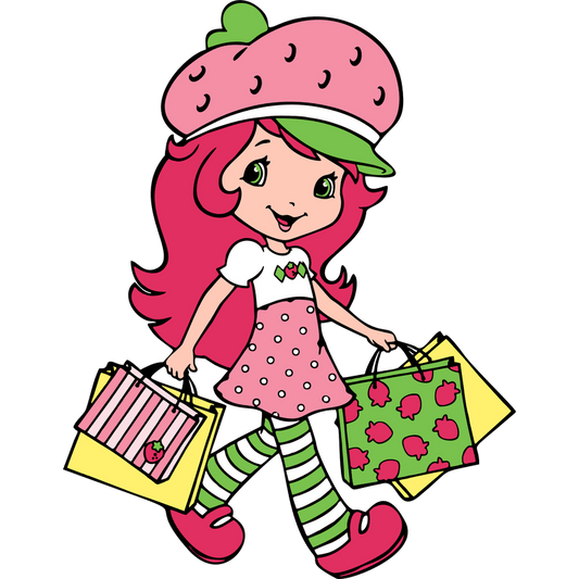 Strawberry-themed animated character cheerfully carrying colorful shopping bags, dressed in a polka-dot dress and striped leggings.DTF Transfers