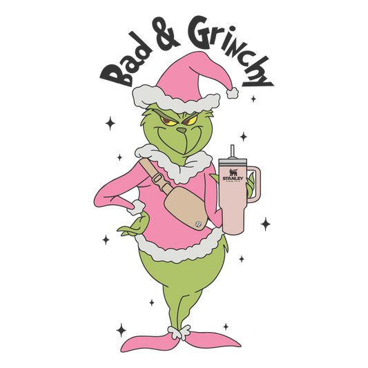 A playful illustration of the Grinch in a pink holiday outfit, holding a Stanley tumbler, exuding a grumpy yet festive vibe.DTF Transfersdtf regular iron