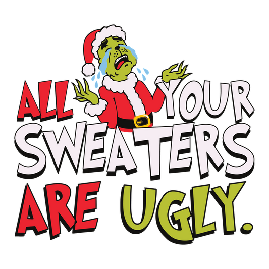 A humorous holiday design featuring a cartoonish character in a Santa hat, proclaiming "All Your Sweaters Are Ugly!"DTF Transfers heat press transfers