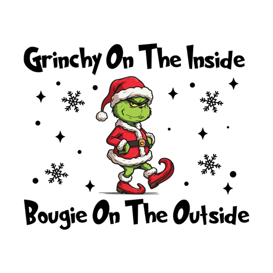 A mischievous green character in a Santa outfit, complete with a red hat and boots, exudes holiday mischief.DTF Transfers dtf prints
