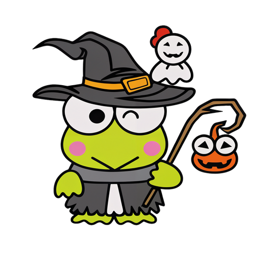 Precio habitual A partir de £0.75 GBPPrecio habitualPrecio unitario / por£2.40 GBPPrecio de oferta A partir de £0.75 GBPUna rana verde caprichosa con sombrero y capa de bruja sostiene una linterna espeluznante, acompañada por un fantasma amigable.Transferencias DTF
