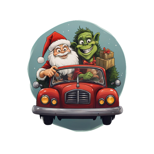 Santa Claus and a cheerful green creature drive a classic red car, spreading holiday joy with presents in tow.DTF Transfers dtf prints