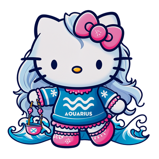 Hello Kitty is styled as an Aquarius with flowing hair, wearing a blue sweater adorned with the zodiac symbol and carrying a mini boat.DTF Transfers dtf prints