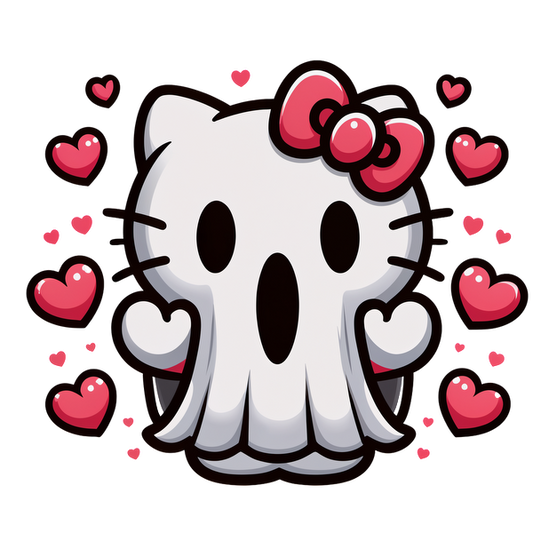 Un personaje lindo y espeluznante combina un diseño de calavera con características de Hello Kitty, rodeado de corazones coloridos para un toque divertido. Transferencias DTF