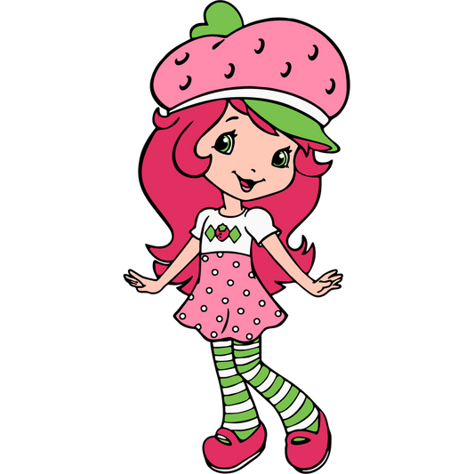 Meet a cheerful character with vibrant pink hair, wearing a strawberry-themed hat, a polka dot dress, and striped leggings!DTF Transfers