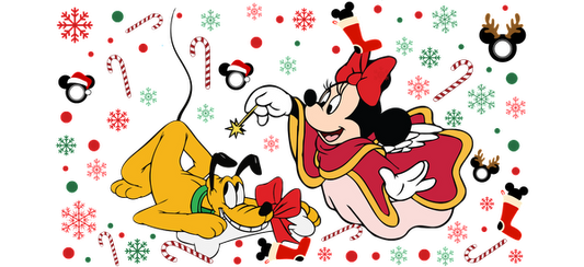 Minnie Mouse, dressed in a festive outfit, joyfully interacts with Pluto amidst a cheerful holiday backdrop of candy canes and decorations.UV Transfers dtf transfers
