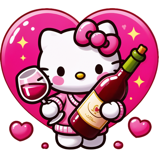 Lindo personaje de dibujos animados sosteniendo una botella de vino tinto y una copa, rodeado de corazones rosados y un fondo de corazón vibrante. Transferencias DTF