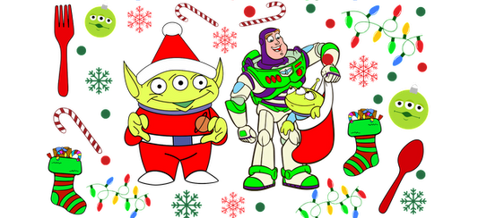 Celebrate the holidays with this vibrant illustration featuring festive aliens and a heroic space ranger surrounded by colorful decorations!UV Transfers dtf transfers